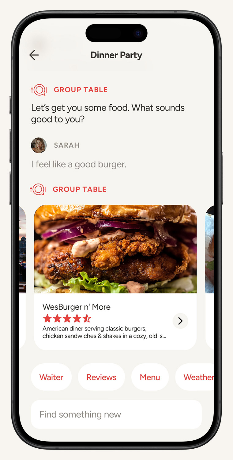 Group Table emerged from the belief that dining should be about getting together. So we set out to make the first AI powered social-restaurant app. We wanted to make something that gets to know everyone's preferences, so it can make smart recommendations, so you spend less time finding and more time dining!